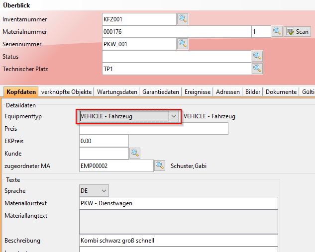 Für Wartungsintervalle können im Reiter Wartungsdaten auch Termine für die letzten / nächsten Wartungen eingetragen werden oder sogar detaillierte Prüfpläne mit Vorgängen nach Art eines Fertigungsauftrages können angegeben werden. Weiterhin können Garantiedaten und Ereignisse bspw. über Störungen, Wartungsarbeiten, Reparaturen usw. hinterlegt werden. Damit lässt sich eine komplette Fahrzeughistorie abbilden.