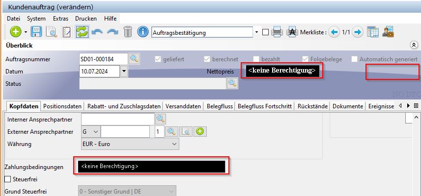 Die gemachten Einstellungen sind einer speziellen ACL zugeordnet. Damit für die Felder die gemachten Einstellungen tatsächlich greifen, muss diese ACL den entsprechenden Datenobjekten zugeordnet werden. Das passiert im Reiter "Systemdaten", im Feld ACL. Für diejenigen Datenobjekte mit der zugeordneten ACL greifen dann die zugeordneten Berechtigungen. Das Ergebnis sieht wie folgt aus, wenn Nettopreis und Zahlungsbedingungen geschwärzt, der Bruttopreis komplett ausgeblendet wird.