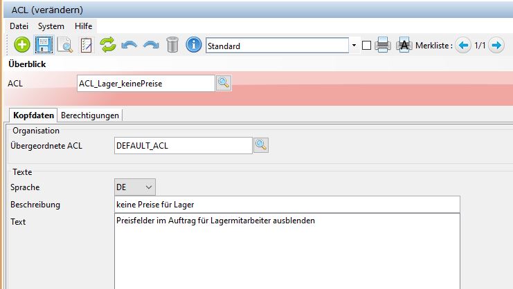 Im ersten Schritt ist es notwendig eine ACL anzulegen, die diese Felder ausblenden. Navigieren Sie zu Zentrale Funktionen / ACL und legen Sie dort eine ACL an. bspw. "ACL_Lager_keinePreise" und speichern Sie diese.